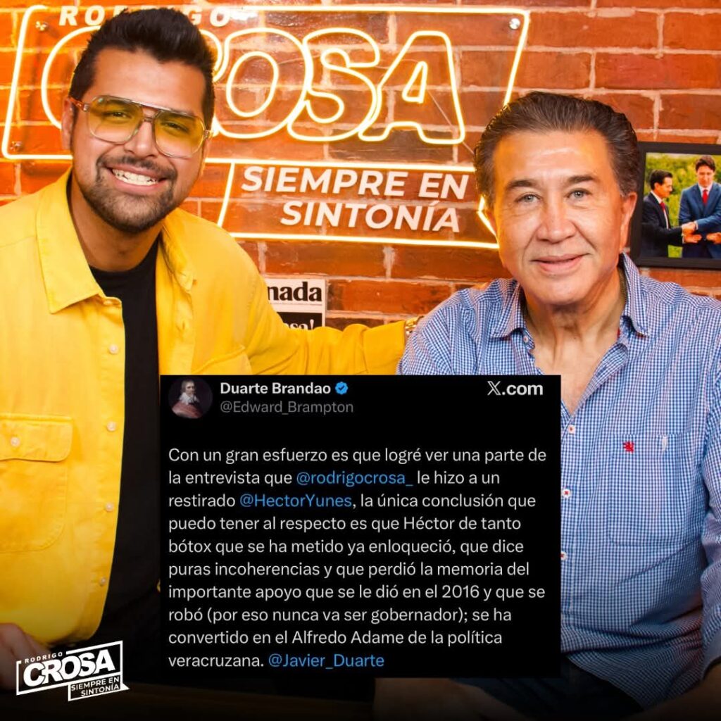 “Con un gran esfuerzo es que logré ver una parte de la entrevista que Rodrigo Crosa le hizo a un restirado Héctor Yunes, la única conclusión que puedo tener al respecto es que Héctor de tanto bótox que se ha metido ya enloqueció, que dice puras incoherencias y que perdió la memoria del importante apoyo que se le dio en el 2016 y que se robó (por eso nunca va ser gobernador); se ha convertido en el Alfredo Adame de la política veracruzana”, posteó Javier Duarte en su cuenta de X (antes Twitter).